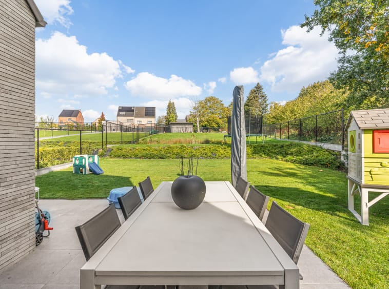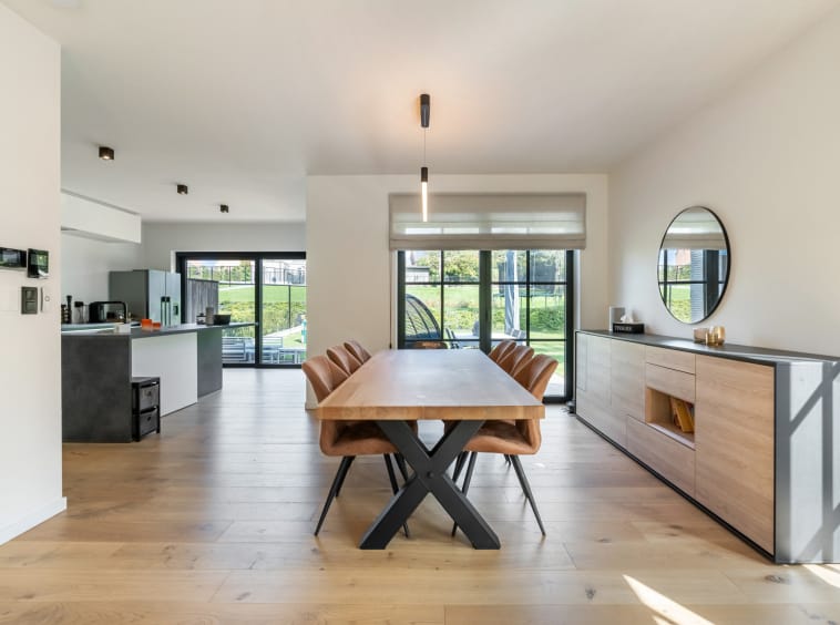 De inkomhal met gastentoilet leidt naar de lichtrijke leefruimte, waar grote raampartijen zorgen voor een naadloze verbinding tussen binnen en buiten. De woonkamer met eetgedeelte vormt samen met de open keuken het hart van de woning – een stijlvolle plek waar comfort en elegantie hand in hand gaan. Aansluitend bevindt zich een praktische berging. Vanuit zowel de leefruimte als de keuken geniet u van een prachtig zicht op het ruime terras en de uitgestrekte tuin, die dankzij de groene omgeving en het ontbreken van doorgaand verkeer een oase van rust vormt.
